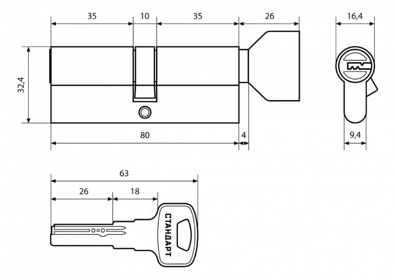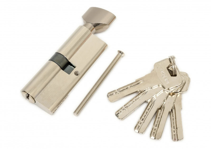 Цилиндровый механизм Стандарт устанавливается вместе с врезным замком. Запирание осуществляется с помощью английского ключа, который идет в комплекте в количестве 5 штук. Кулачок механизма выдвинут на 30 градусов от плоскости, что препятствует выбиванию цилиндра из двери.