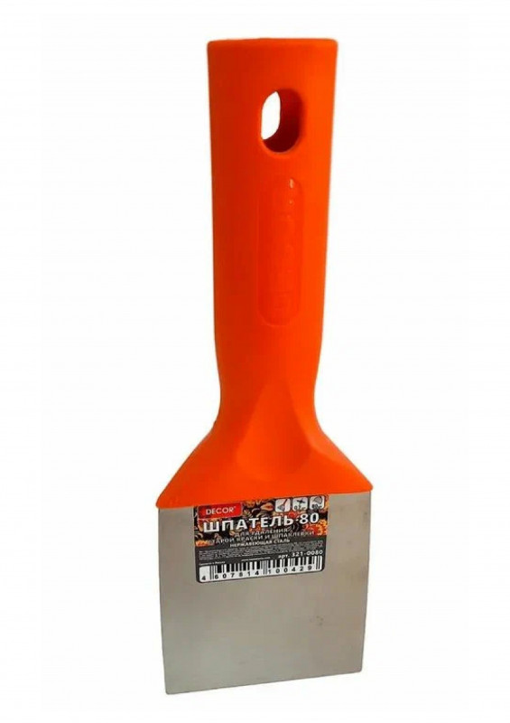 Шпатель-скребок для удаления краски 80мм, сталь 0,7мм, резьба, DECOR 321-080; 11612115 Для легкого удаления: краски штукатурки ржавчины Внутри коническая резьба под бытовой стержень с отверстие для фиксации саморезом Материал Нержавеющая полированная сталь 0,7 мм, ручка из первичного прочного пластика. Высота лезвия 85мм